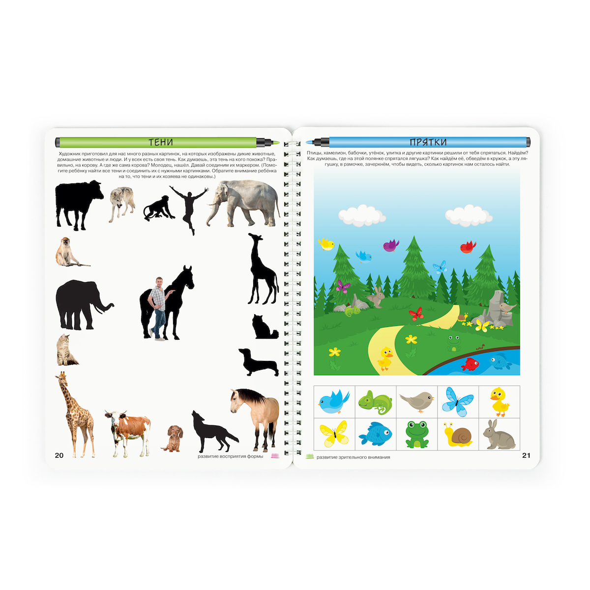 Тетрадь многоразовая: зачёркивать, соединять и стирать можно сколько угодно раз. К пособию прилагается маркер зелёного цвета, следы от которого легко стираются сухой губкой или салфеткой. Все картинки яркие и красочные, а страницы изготовлены из ламинированного картона формата А4. Для безопасной работы края тетради закруглены, а листы скреплены двойной пружиной.