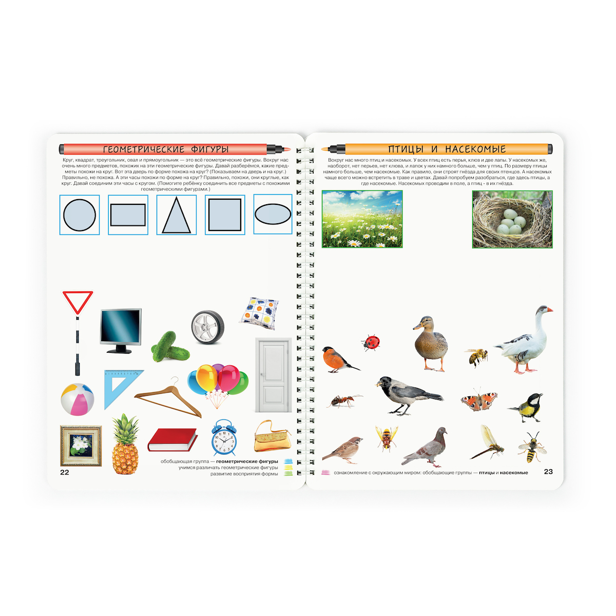 Мы познакомимся со следующими обобщающими группами: виды транспорта, профессии, зимние и летние виды развлечений, фрукты и овощи, мебель и бытовые приборы, геометрические фигуры, насекомые и птицы, дикие и домашние животные. Выясним, что пригодится на стройке и в школе, что было сначала и что потом – и многое другое.