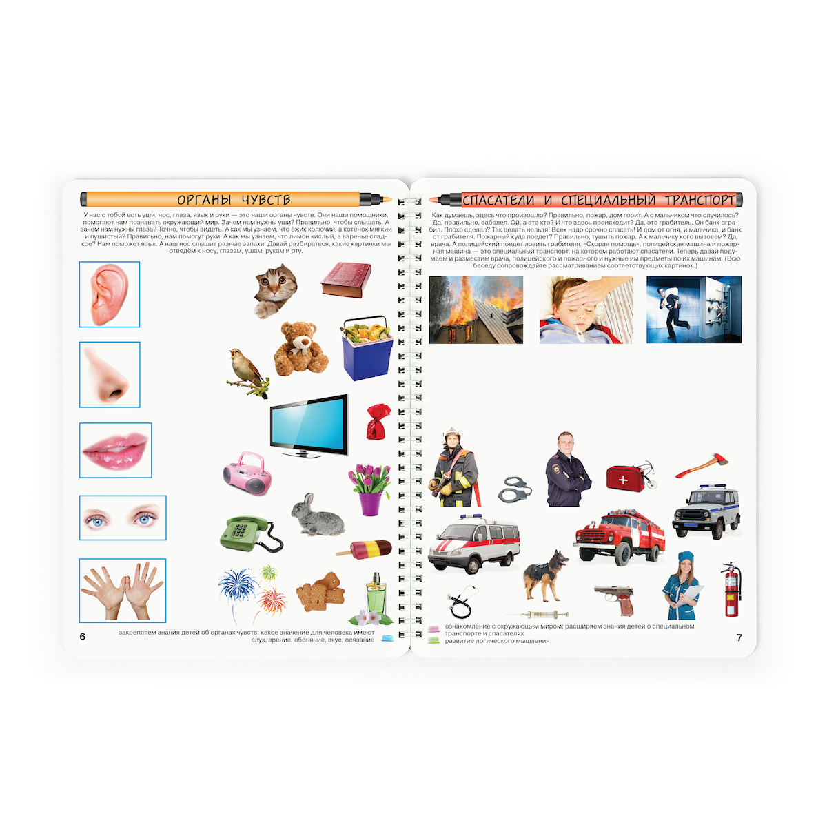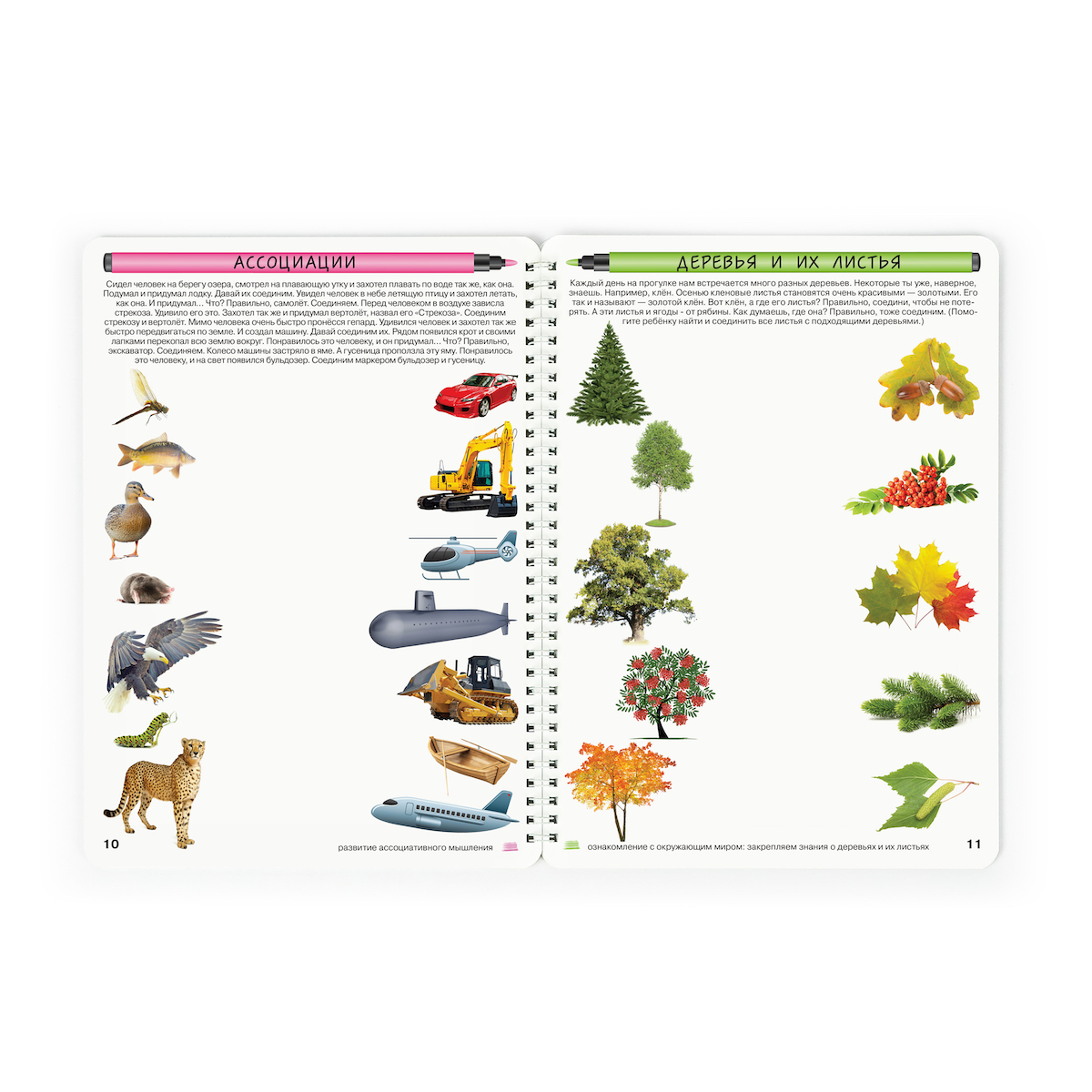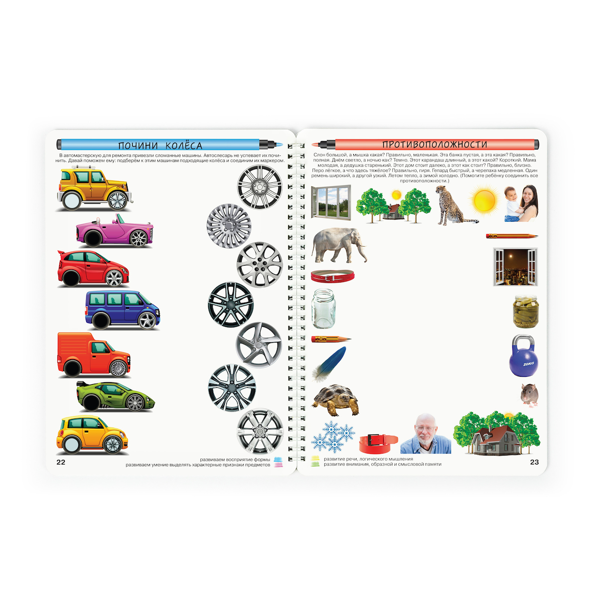 Тетрадь многоразовая: зачёркивать, соединять и стирать можно сколько угодно раз. К пособию прилагается маркер зелёного цвета, следы от которого легко стираются сухой губкой или салфеткой. Все картинки яркие и красочные, а страницы изготовлены из ламинированного картона формата А4. Для безопасной работы края тетради закруглены, а листы скреплены двойной пружиной.