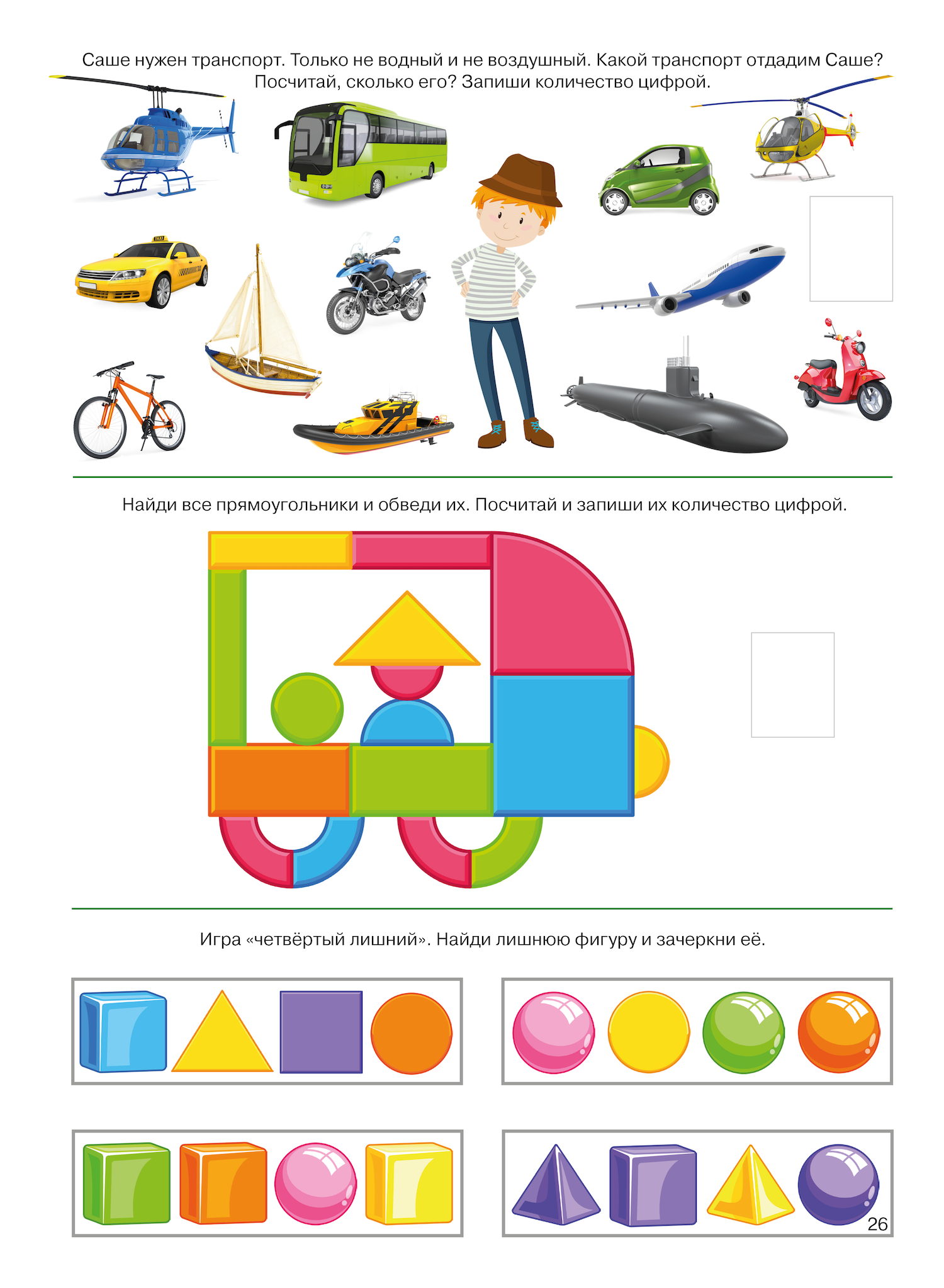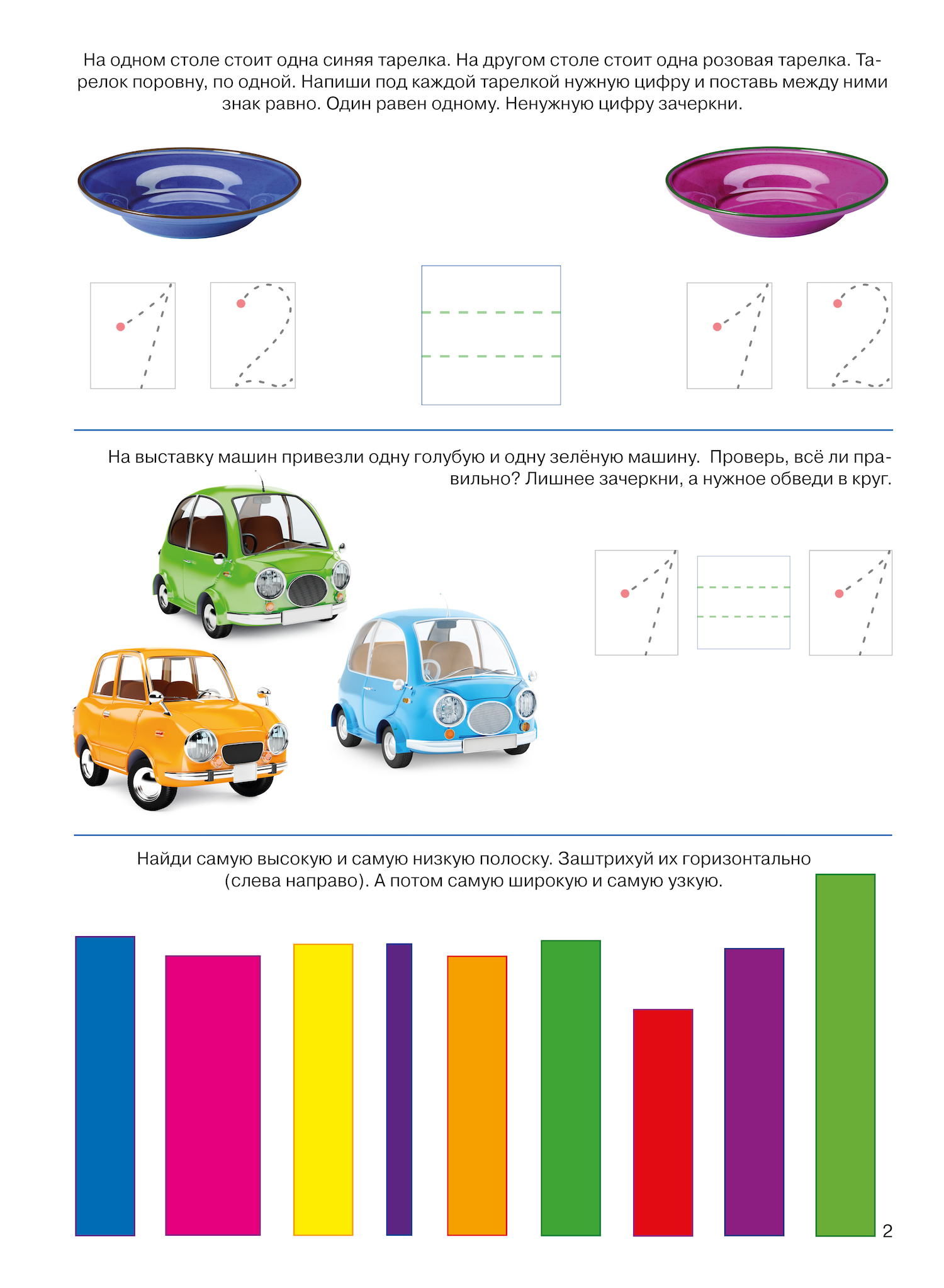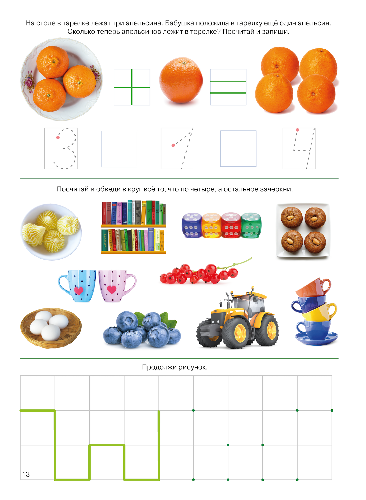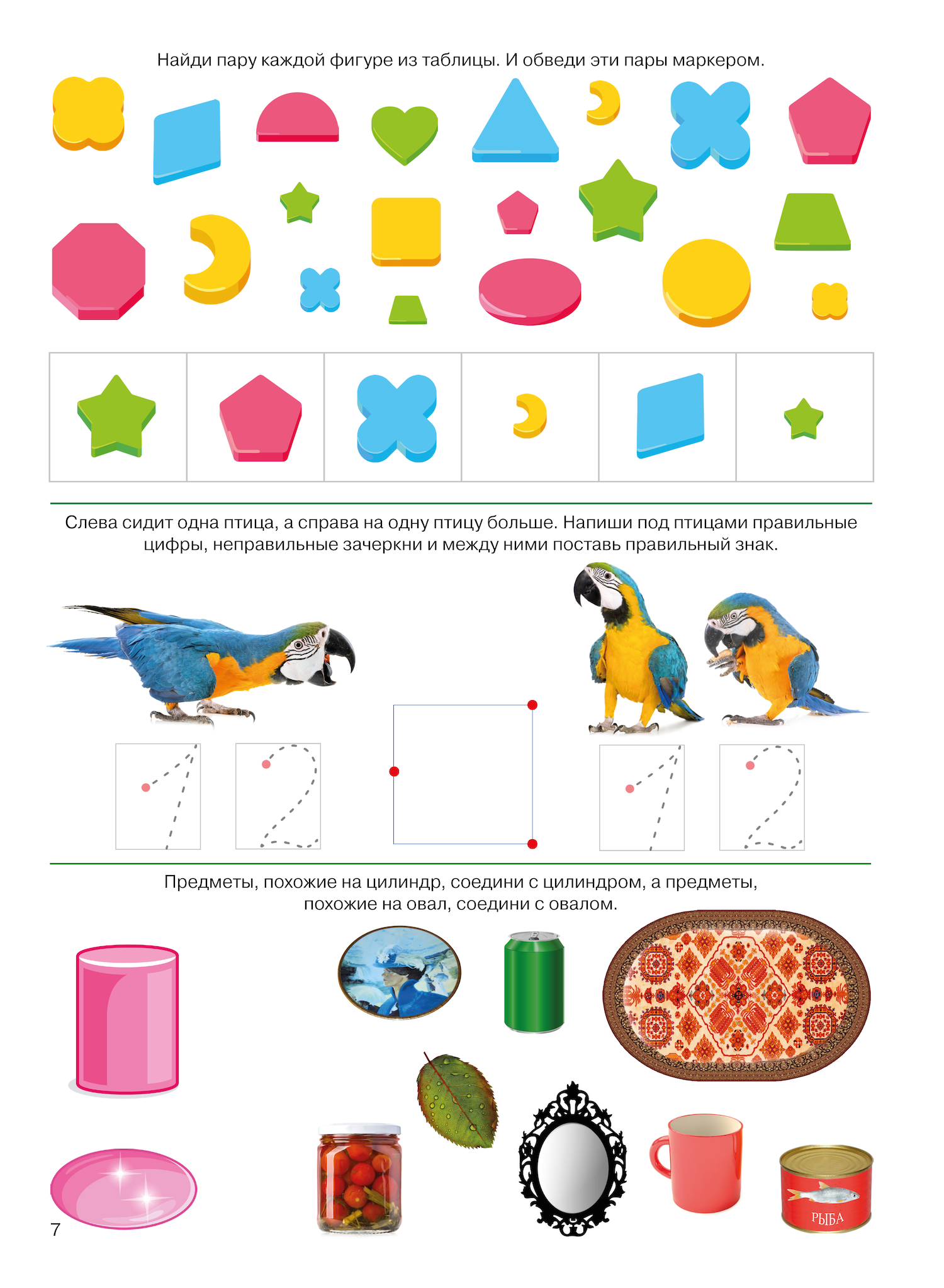 В тетради много графических (обвести, зачеркнуть, заштриховать) и логических (найти и посчитать только инструменты) заданий. Так мы готовим руку ребёнка к письму, улучшаем концентрацию внимания, тренируем память, мышление и восприятие.