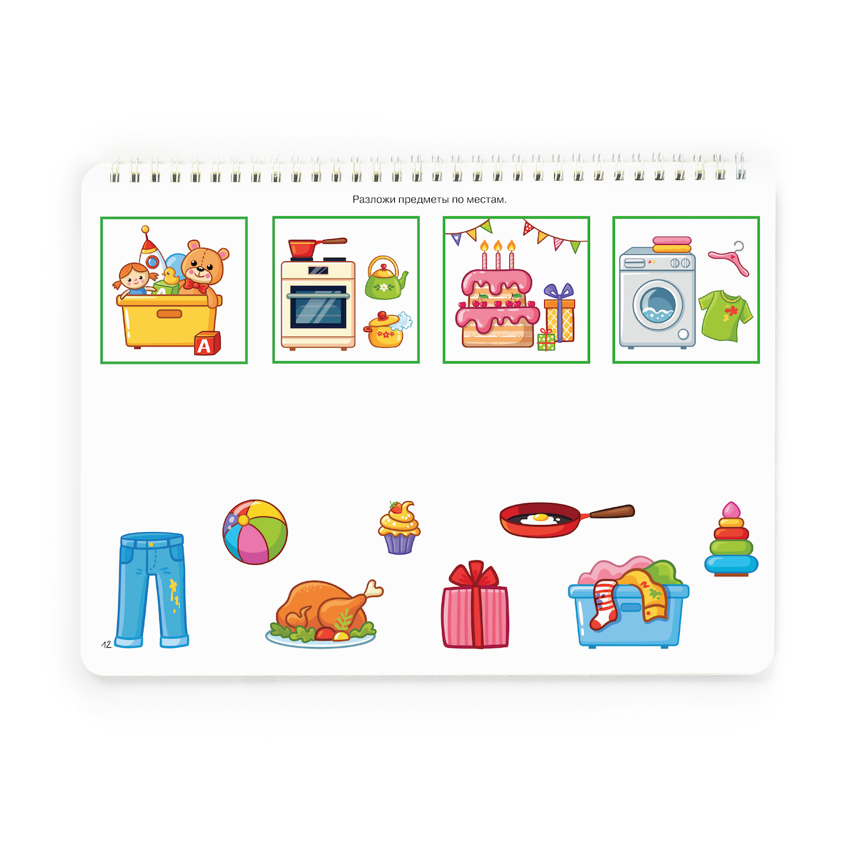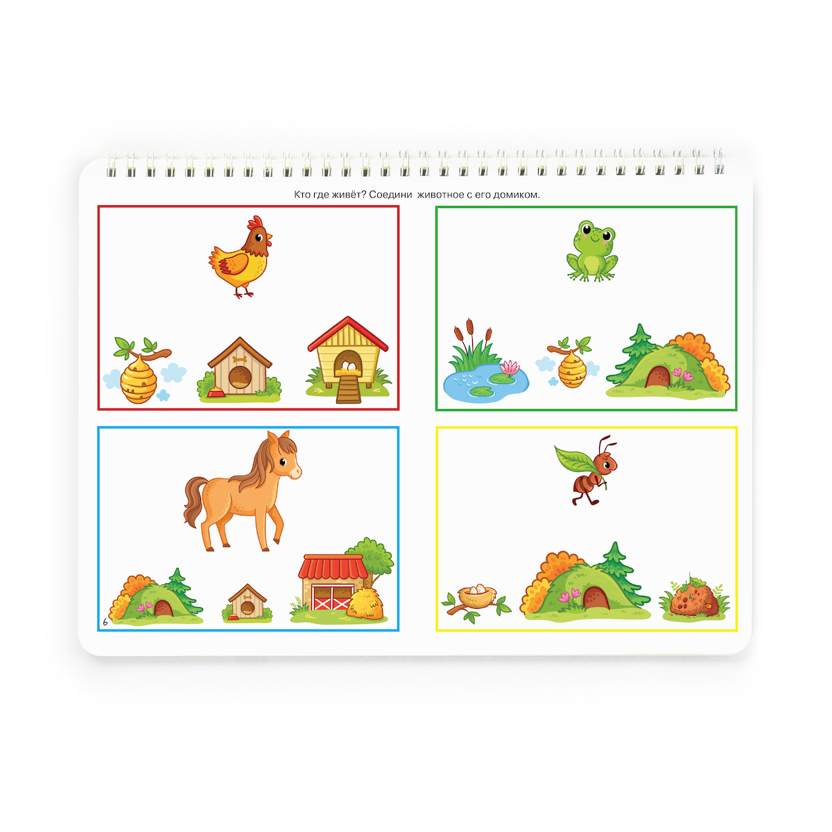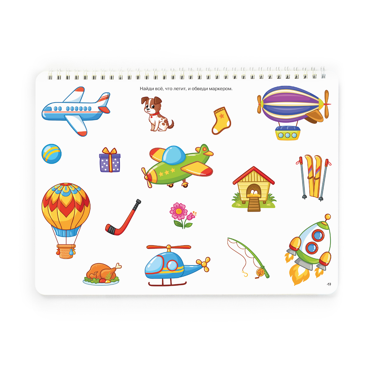 Книга многоразовая: заниматься по ней можно сколько угодно раз. К пособию прилагается зелёный маркер, следы от которого легко стираются сухой губкой или салфеткой. Все картинки яркие и красочные, а страницы изготовлены из ламинированного картона формата А4. Для безопасной работы края тетради закруглены, а листы скреплены двойной пружиной.