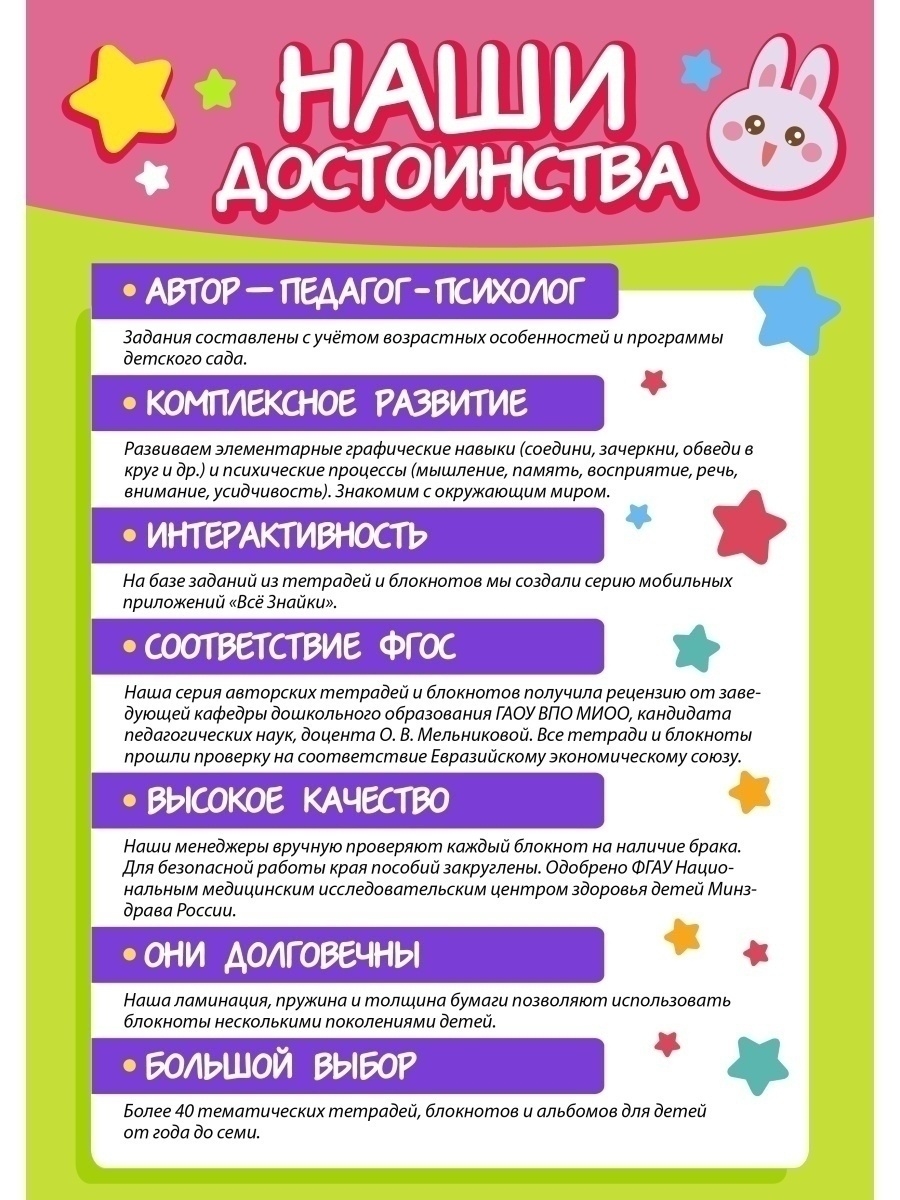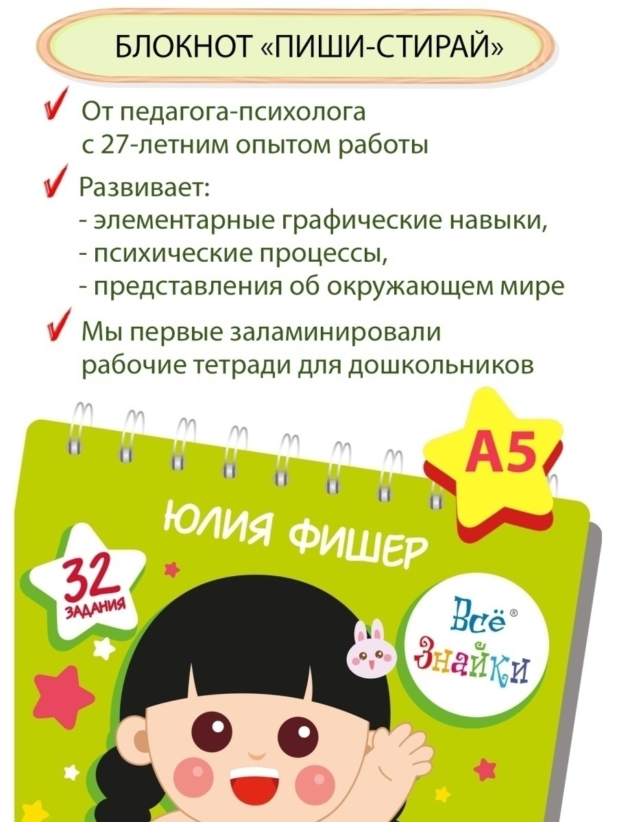 Смотреть обзорыМы издаём развивающие пособия для детей от 1 до 7 лет. Все наши многоразовые тетради, блокноты и альбомы написаны опытными педагогами-психологами, а задания были проверены в ходе многолетней работы с дошкольниками.